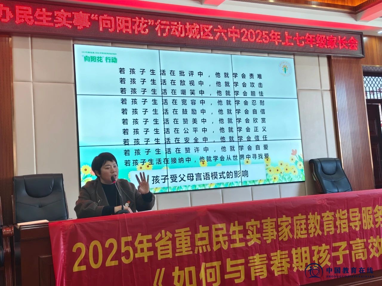为落实上级关于家庭教育的指导精神,扎实有效开展家庭教育指导服务和实践活动,实现家校教育理念同频共振,协同促进孩子自主成长与全面发展。3月19日,湖南省办民生实事家庭教育指导服务“向阳花”行动走进邵东市城区六中。活动特别邀请了家庭教育高级指导师、心理咨询师曾丽云主讲。出席本次活动的领导有邵东市妇联领导李清心,邵东市传统文化发展促进会会长周艳斌,城区六中政教校长罗伟。七年级同学与家长参与了本次活动。