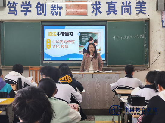 4月23日第二节课,刘超琦老师在2314班带来道德与法治专题复习课《中华优秀传统文化教育》。她妙语连珠,以“非遗火了”开篇,向学生们传达了道法中考的新评分规则;依据“文化”大概念,在学生脑海里快速构建整体知识构架;识记中考高频考点和易错易混题型,并与学生们一起,在真题训练中生成了道法“选择题解题方法”和“文化专题‘意义类’非选择题的解题模式”,引导学生从文化认同走向文化自信。课堂上,学生们或吟诵重点知识,或思辨解题方法,中华文化的根脉在心灵深处悄然生长。